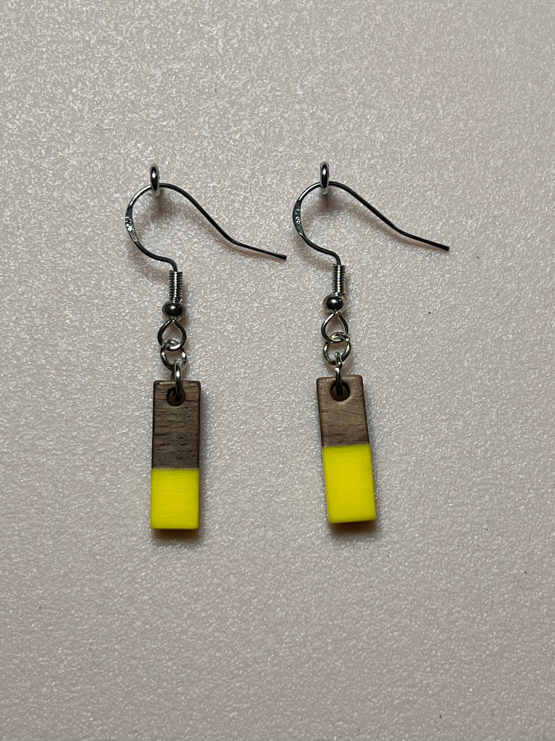 Design: Slim wood-and-resin rectangles with a striking yellow base.